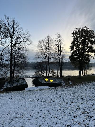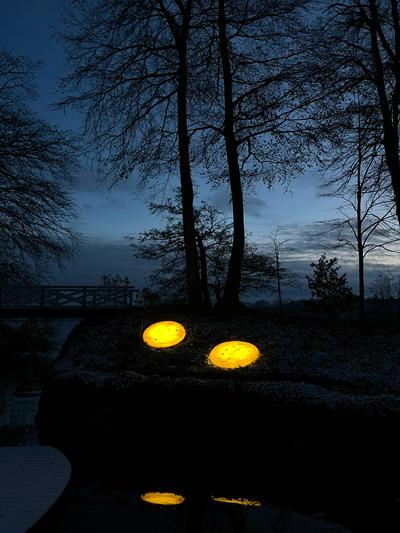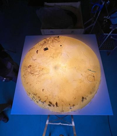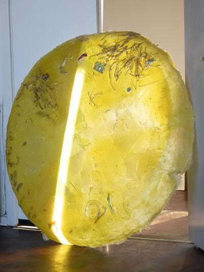 Resin, glass fibre, wax, styrofoam, steel sponge, cocktail parasols, leaves, tea bag, glass, battery, pigment. Ø: 130 cm.