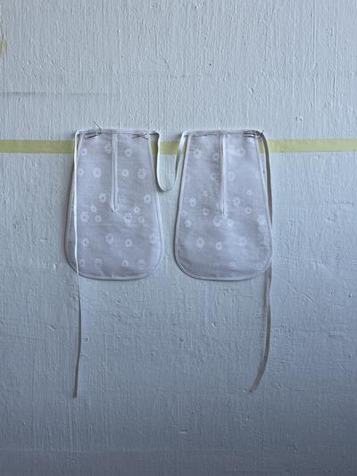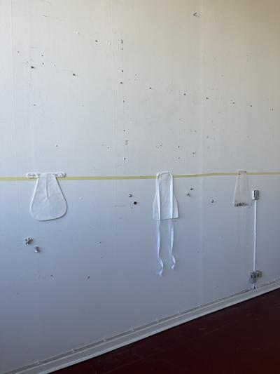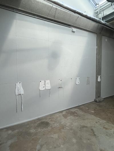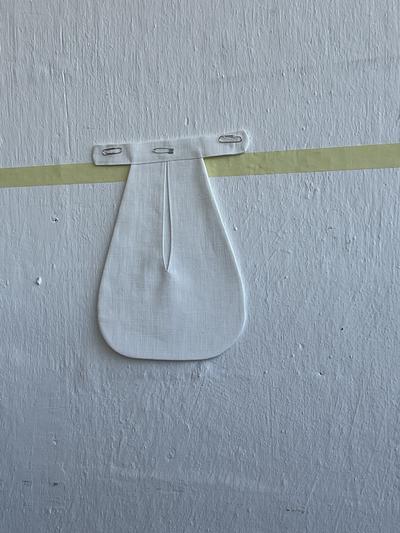 The first install images arrive in my inbox. They show the silk pockets, hung at the height they sit on the body, against a putty coloured wall. Their ties are arranged as if they’ve been blown about by the wind: a washing line!